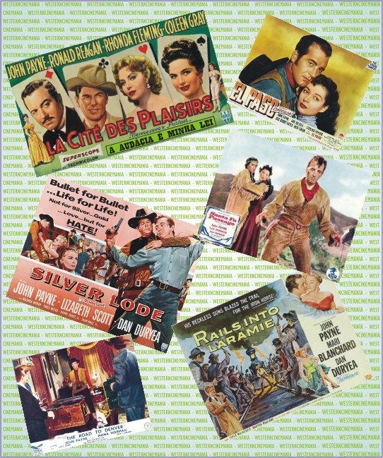 A SÉRIE DE WESTERNS DOS ANOS 50 - Quando os faroestes feitos em série pelos pequenos estúdios agonizavam, começaram a ser feitos westerns, produções independentes de melhor qualidade. John Payne que ainda não havia participado de um western atuou pela primeira vez no gênero em “El Paso”, de 1949, com belo elenco composto por Gail Russell, Sterling Hayden, George Gabby Hayes e Dick Foran. Ao lado da linda Rhonda Fleming, Payne estrelou em 1950 “A Águia e o Falcão” (The Eagle and the Hawk). Em 1951 Payne atuou no faroeste “Passage West”, com Arleen Whelan. Todos estes três westerns foram dirigidos por Lewis R. Foster e produzidos pela Pine-Thomas Productions. A seguir Payne fez “Sangue do Sul” (The Vanquished), com Jan Sterling, western de 1953. Em 1954 John Payne se defrontou com Dan Duryea em “Senda de Sangue” (Rails into Laramie), em que a heroína era Mari Blanchard. Nesse mesmo ano John Payne voltou a ter Dan Duryea como inimigo, desta vez chamado McCarthy, no excepcional pequeno western de Allan Dwan “Homens Indomáveis” (Silver Lode), já comentado neste blog, tendo Lizabeth Scott como o interesse romântico. “Massacre Traiçoeiro” (Santa Fé Passage), de William Witney, é de 1955 e tem no elenco o charme de Faith Domergue, além de Rod Cameron e Slim Pickens. Allan Dwan dirigiu novamente John Payne que interpretou o jogador conhecido por 'Tennessee' em “A Audácia é Minha Lei” (Tennessee’s Partner), com Rhonda Fleming e Ronald Reagan, western de 1955. Nesse ano Payne foi dirigido por Joseph Kane em “Renegado Impiedoso” (The Road to Denver), com Lee J. Cobb. Em 1956, sob a direção de Alfred L. Werker e com Ben Johnson no elenco, John Payne estrelou “Sede de Matar” (Rebel in Town), com Ruth Roman como sua esposa no filme. Foram dez westerns naquela que foi a última grande década do gênero.